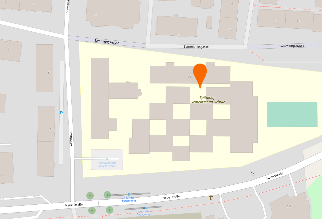 Von den Haltestellen Hafengasse (Linie 4) und Haus der Begegnung (Linie 6) sind es nur wenige Schritte bis zur Spitalhof-Gemeinschaftsschule. Auch die Haltestelle Rathaus ist nicht weit, dort halten außer den Linien 3, 4 und 6 auch viele Überlandbusse.