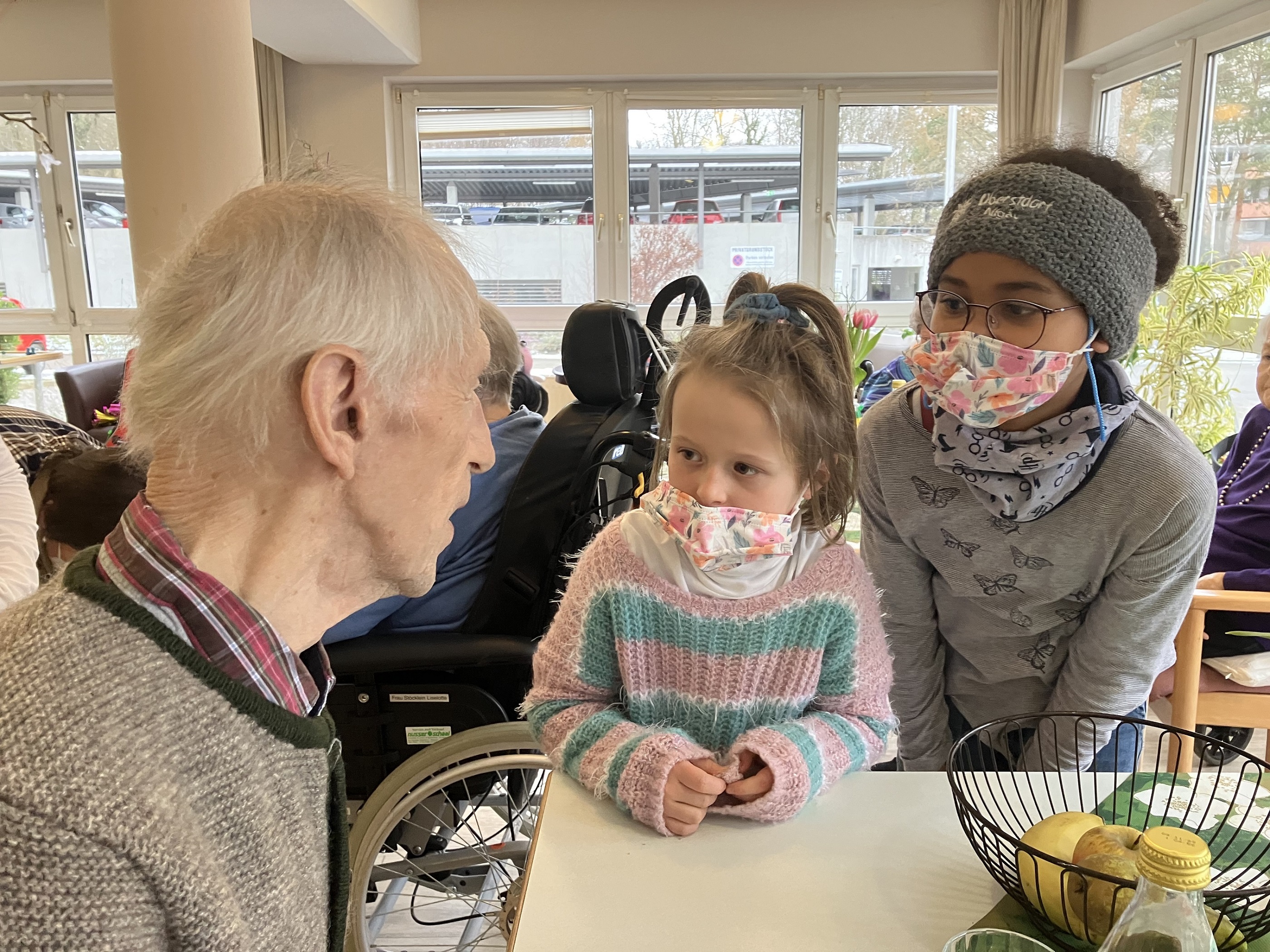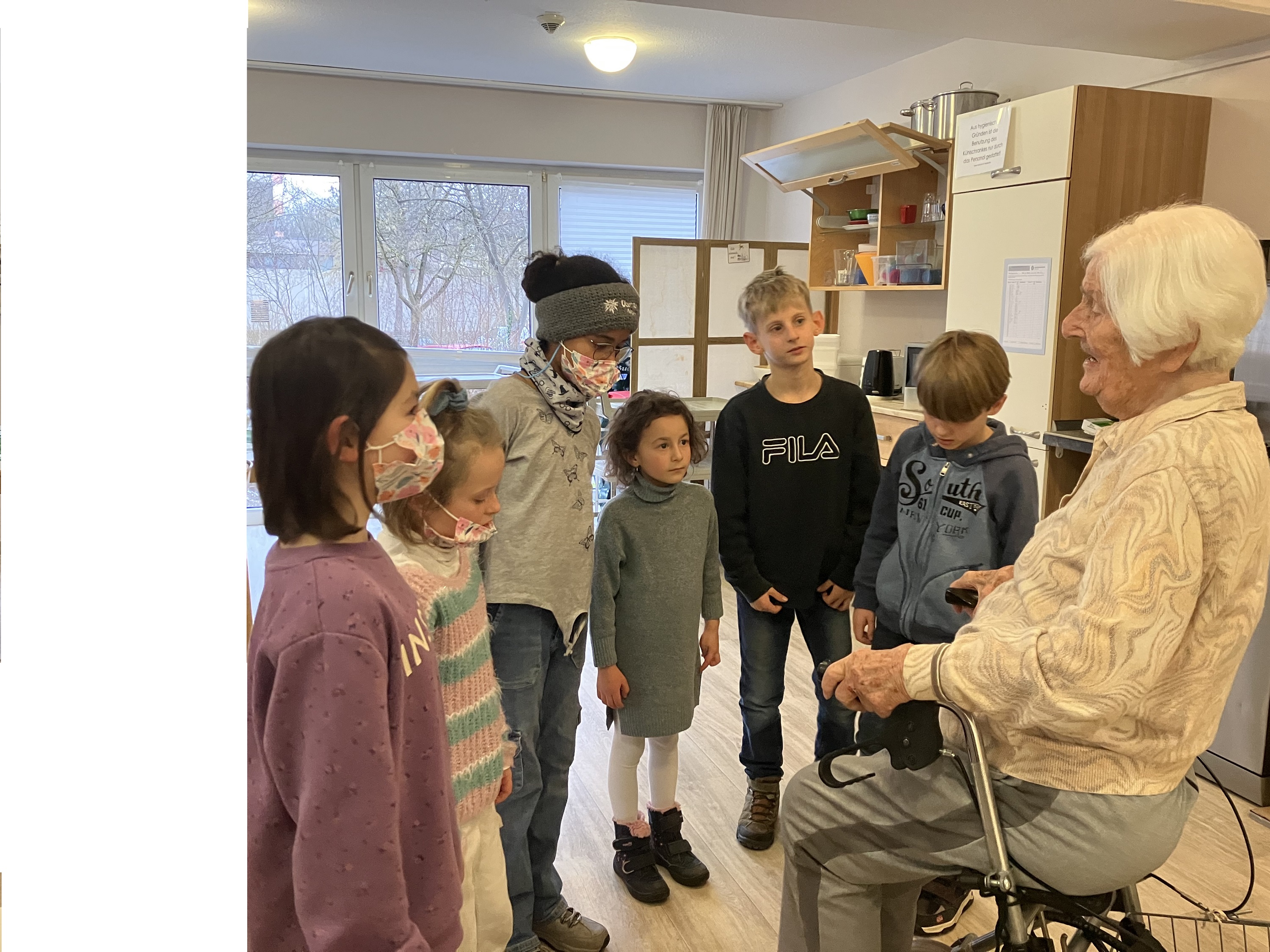 Nach den Herbstferien erzählte eine Schülerin der 3a ganz begeistert von ihrem Besuch in dem Pflegeheim, in dem ihre Mutter arbeitet. Ihre Freude über den Kontakt mit den älteren Bewohner*innen steckte auch die anderen Kinder an. Daher organisierten wir am 23. Januar einen Besuch der Lerngruppe 3a in der Seniorenresidenz. Dort wurden wir überaus freundlich und herzlich empfangen. Die Kinder trugen Lieder vor und unterhielten sich nach anfänglicher Schüchternheit mit den Bewohner*innen. Spannend war es für die 3a vor allem, mehr über die Schulzeit der Bewohner*innen zu erfahren, die teilweise ganz schön lange zurück lag. Die älteste Dame, die wir trafen, war über 100 Jahre älter als die Kinder unserer Lerngruppe! Auf dem Heimweg erklärte ein Mädchen voller Überzeugung, dass das der schönste Tag ihres Lebens gewesen ist. Für uns als Lerngruppe war es definitiv ein besonderer Ausflug!