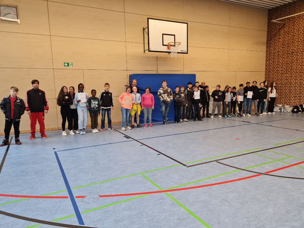 Nach den sportlichen Wochen mit Laufwettbewerben und dem Völkerballturnier wurden am Montag 9.10.23 in der Turnhalle die Sieger und Bestplatzierten geehrt.