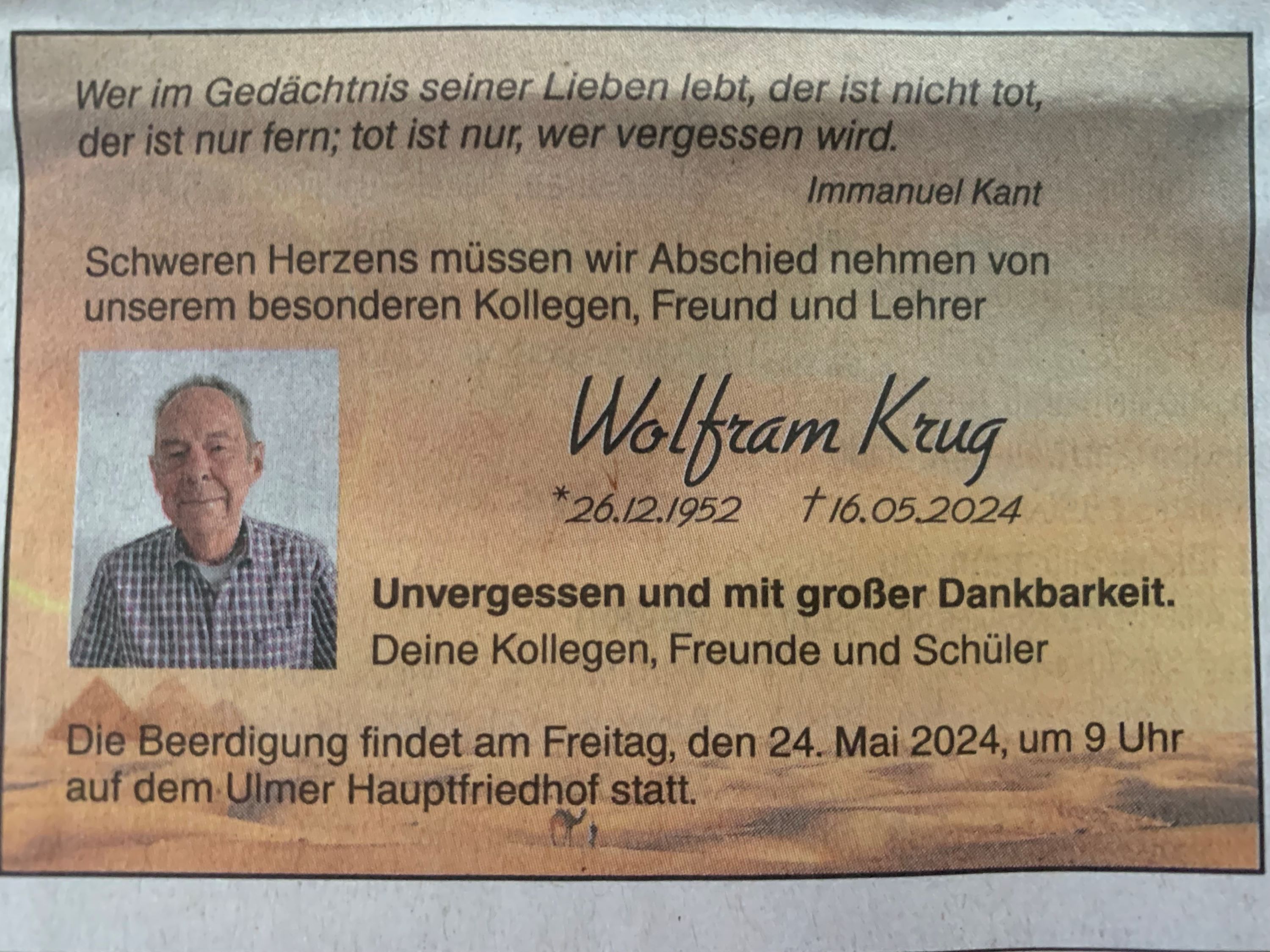 Schweren Herzens haben wir heute mit der Familie, den Angehörigen, ehemaligen und aktuellen Schüler*innen und Kolleg*innen in einer würdevollen Trauerfeier von einem ganz besonderen Menschen und Lehrer Wolfram Krug Abschied genommen.