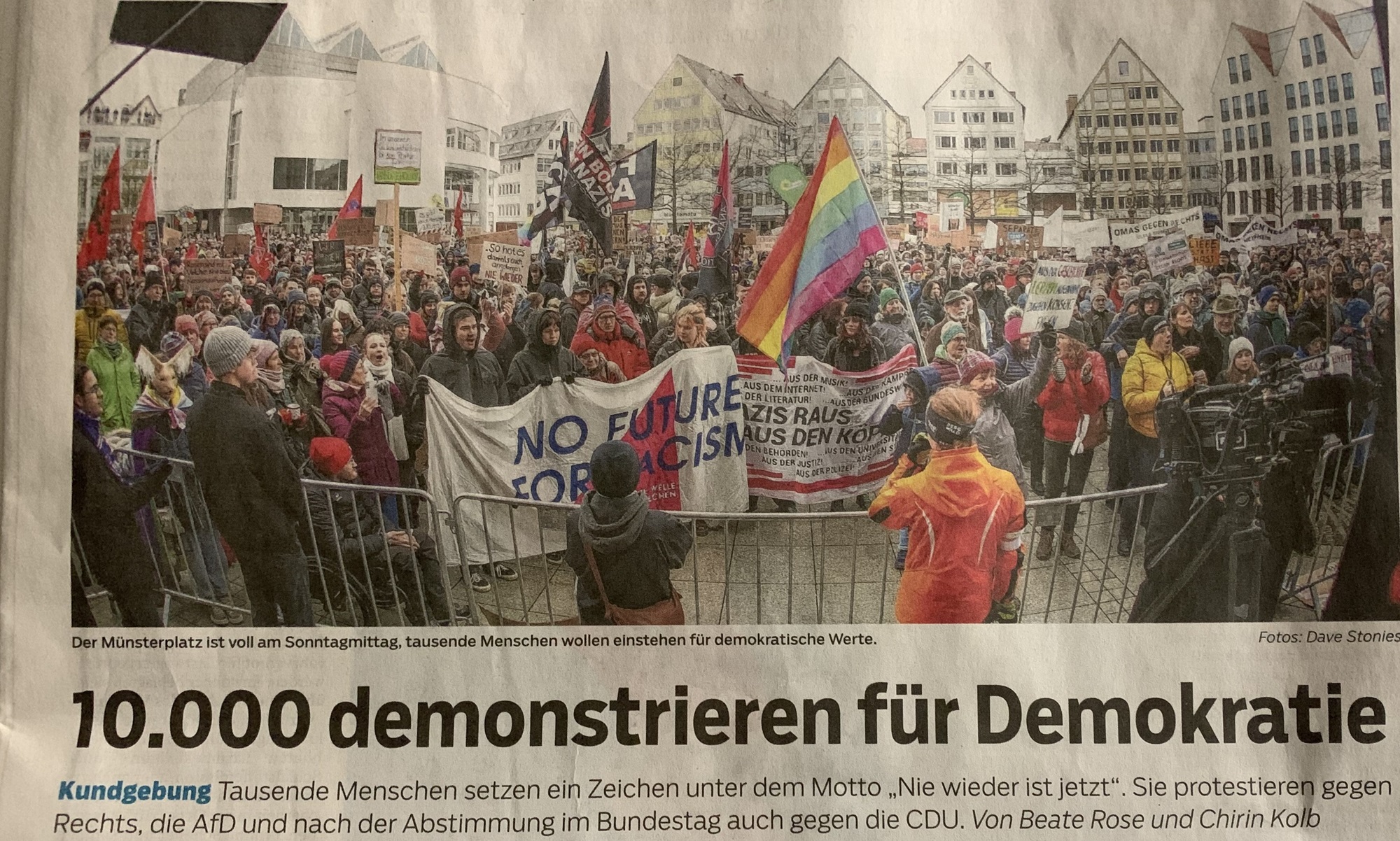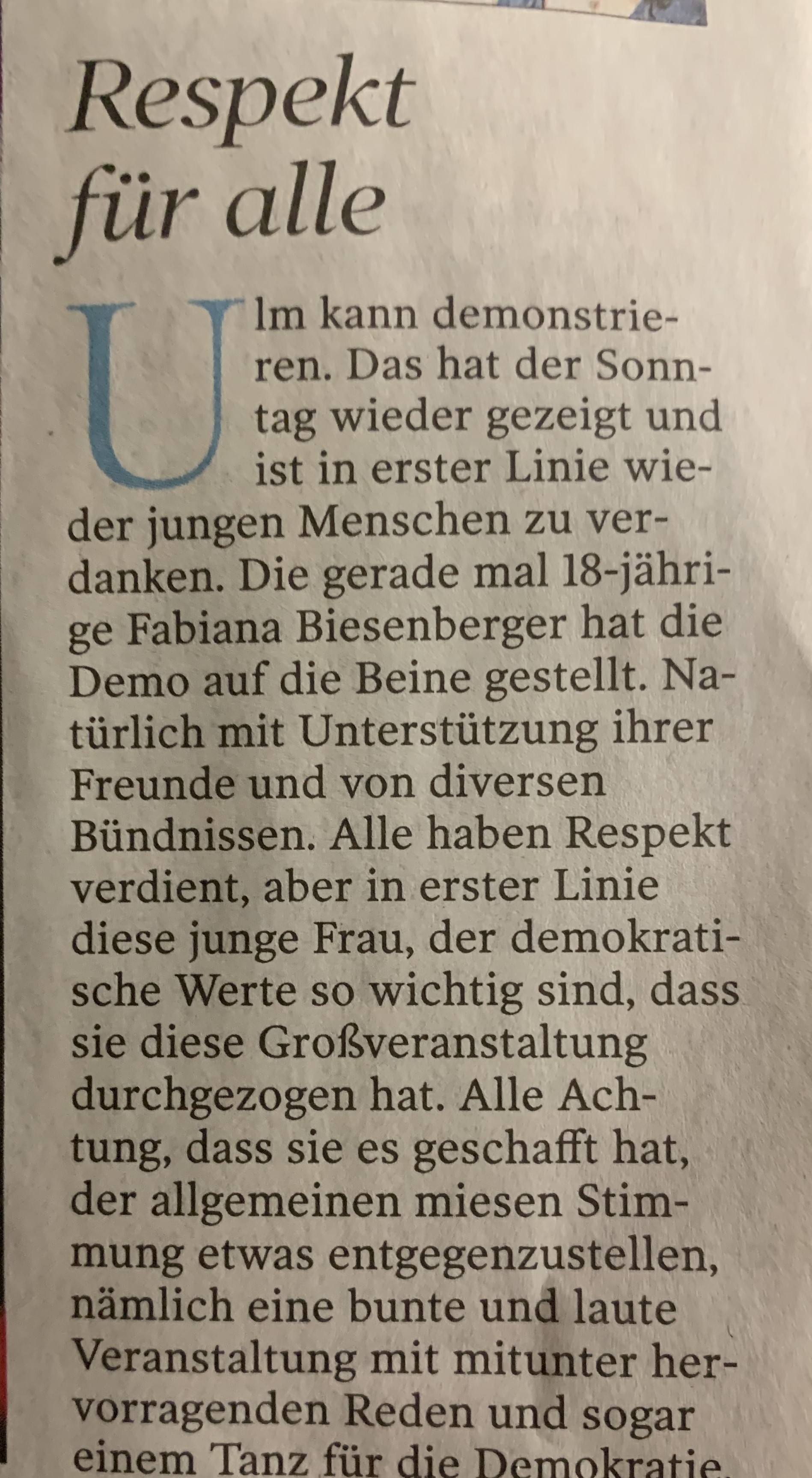 Außerdem berichtet Herr Felber auch von der Demo gegen Rechts - die gestern auf dem Münsterplatz stattgefunden hat und dabei auch Schüler*innen und Lehrer*innen unserer Schule dabei waren. So wird unser Motto: RESPET & TOLERANZ richtig gelebt.
